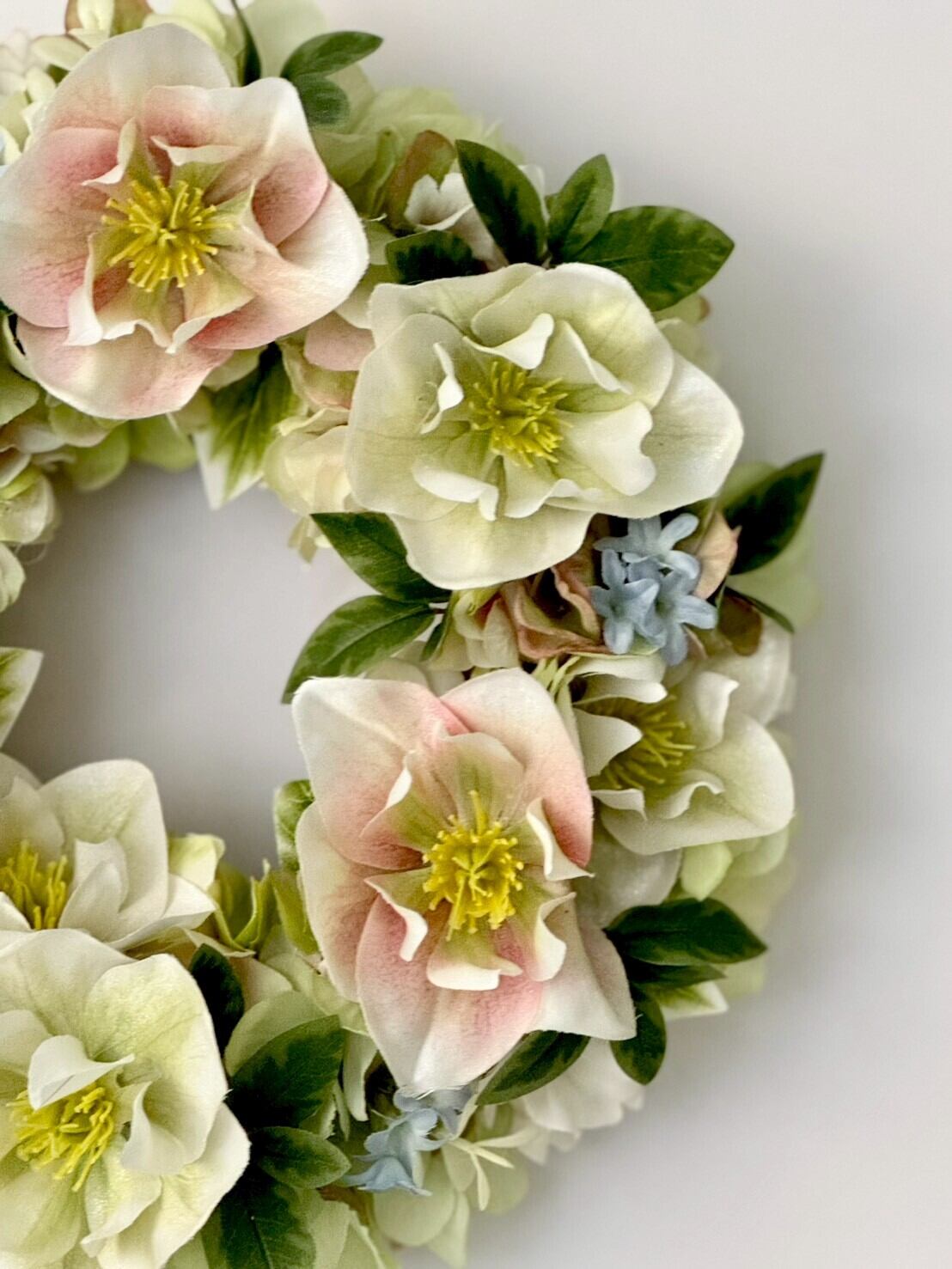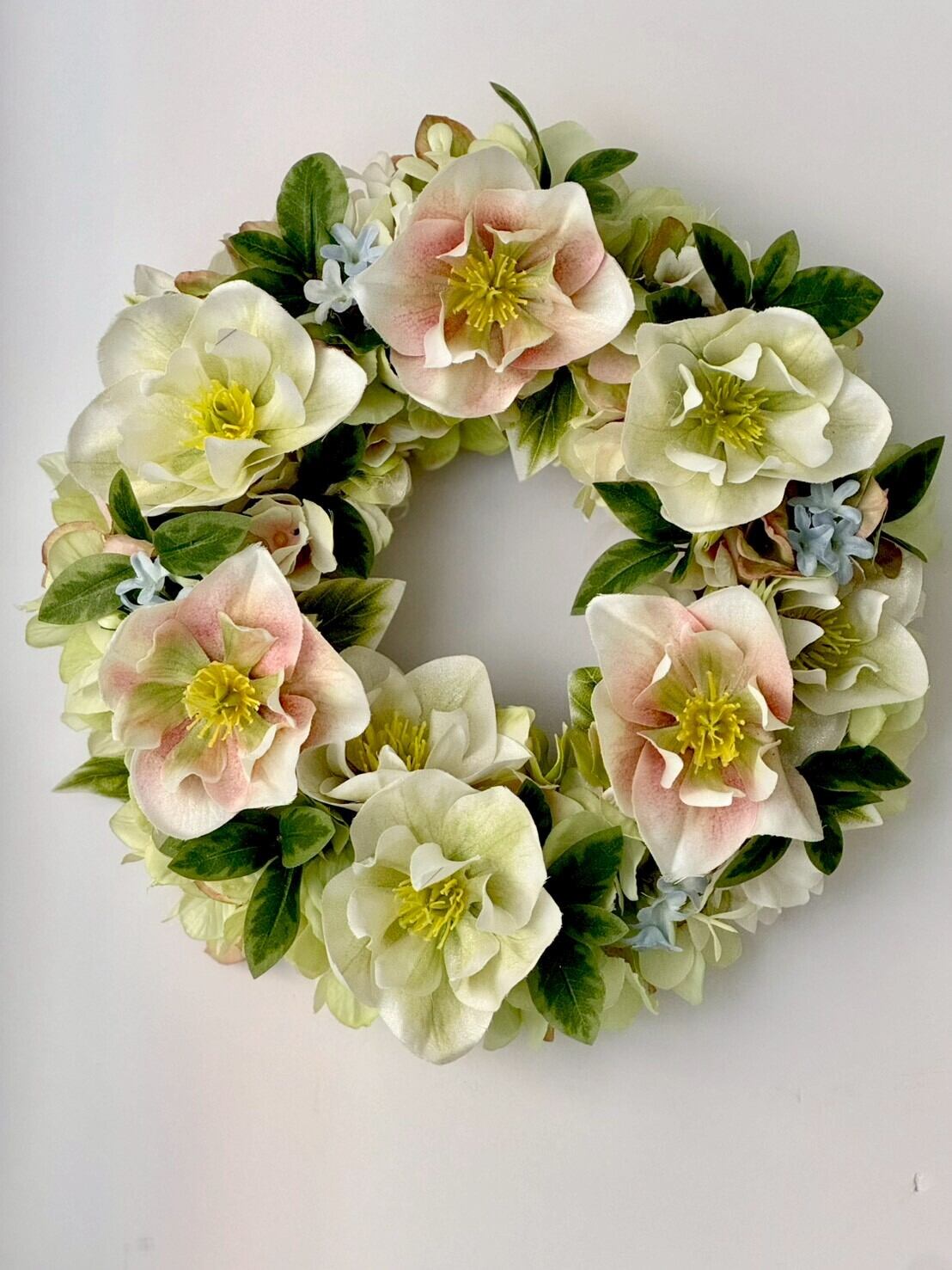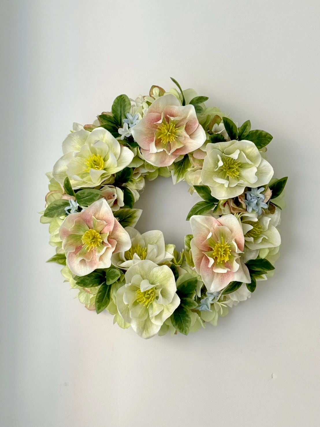 淡い優しい色合いの2種類のクリスマスローズとアジサイ