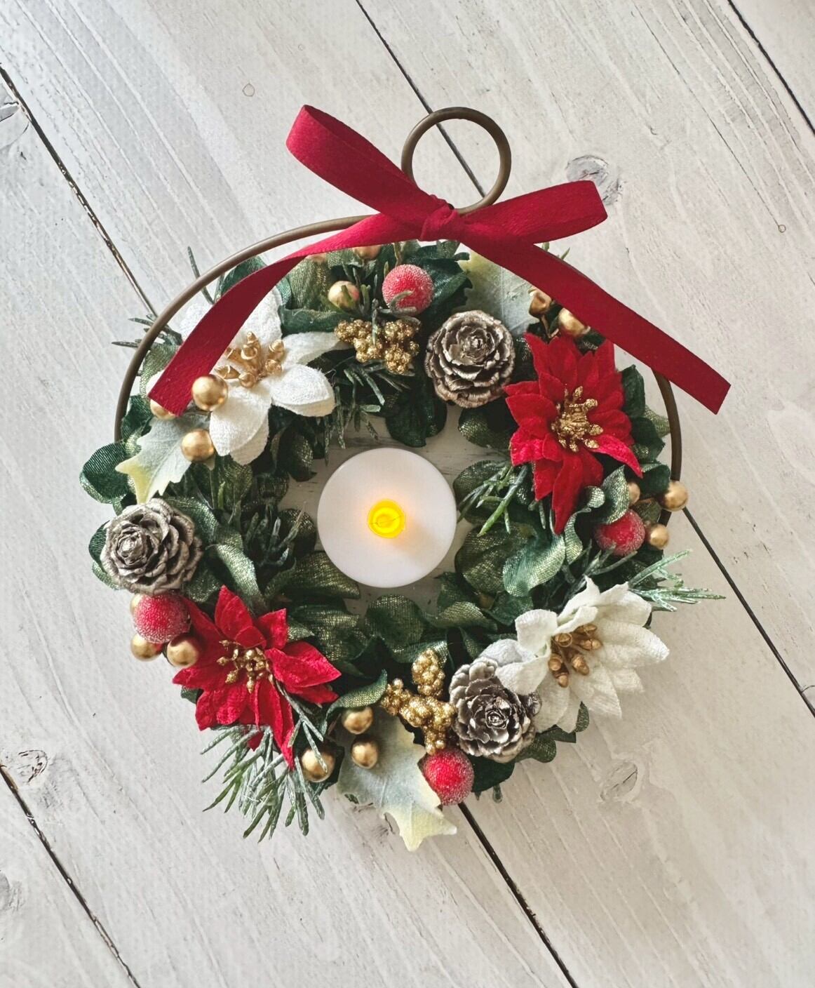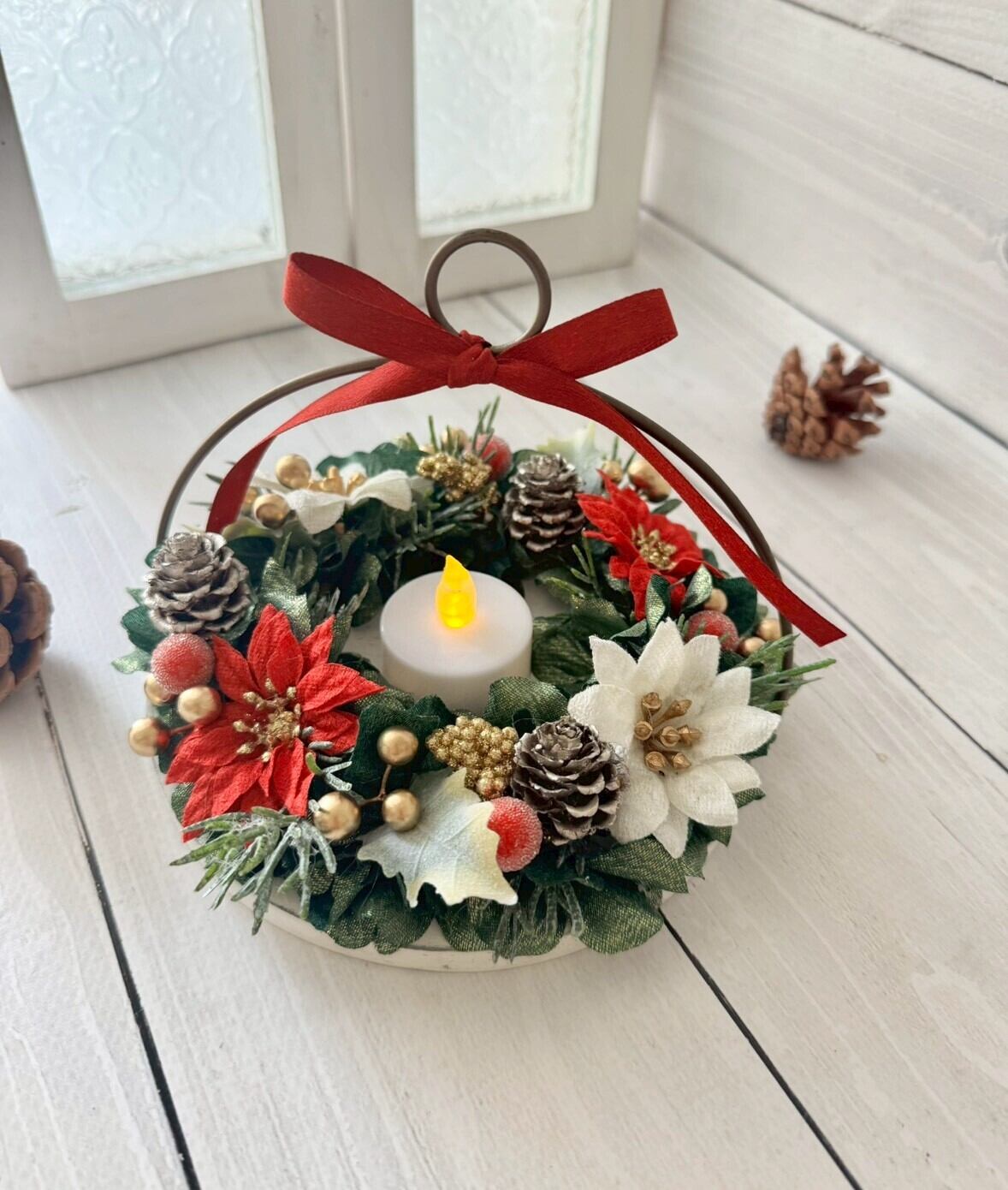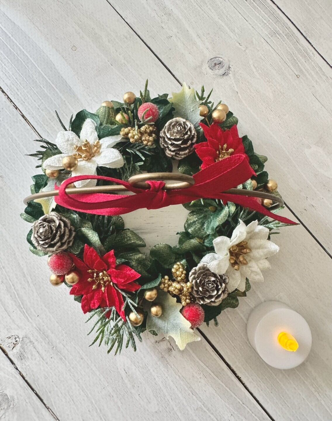 赤と白のポインセチアや実物をリース状にアレンンジした