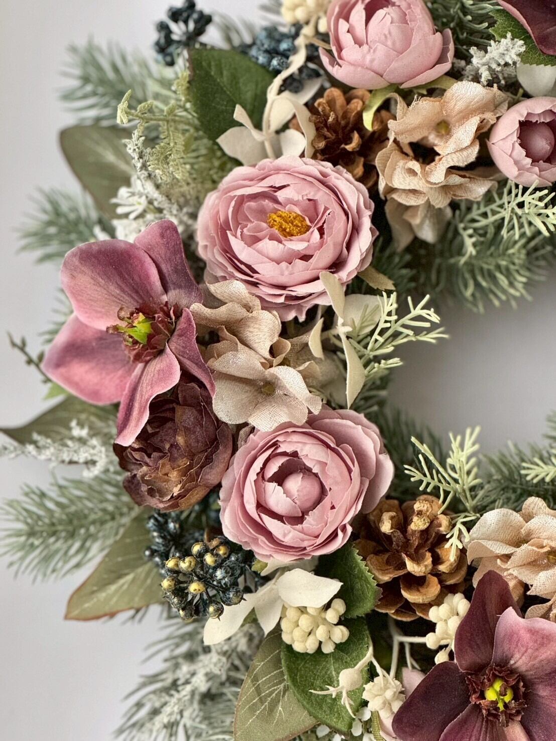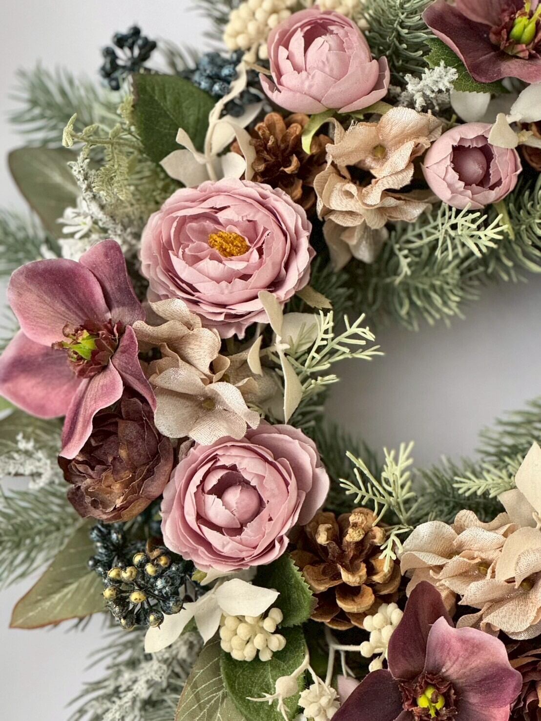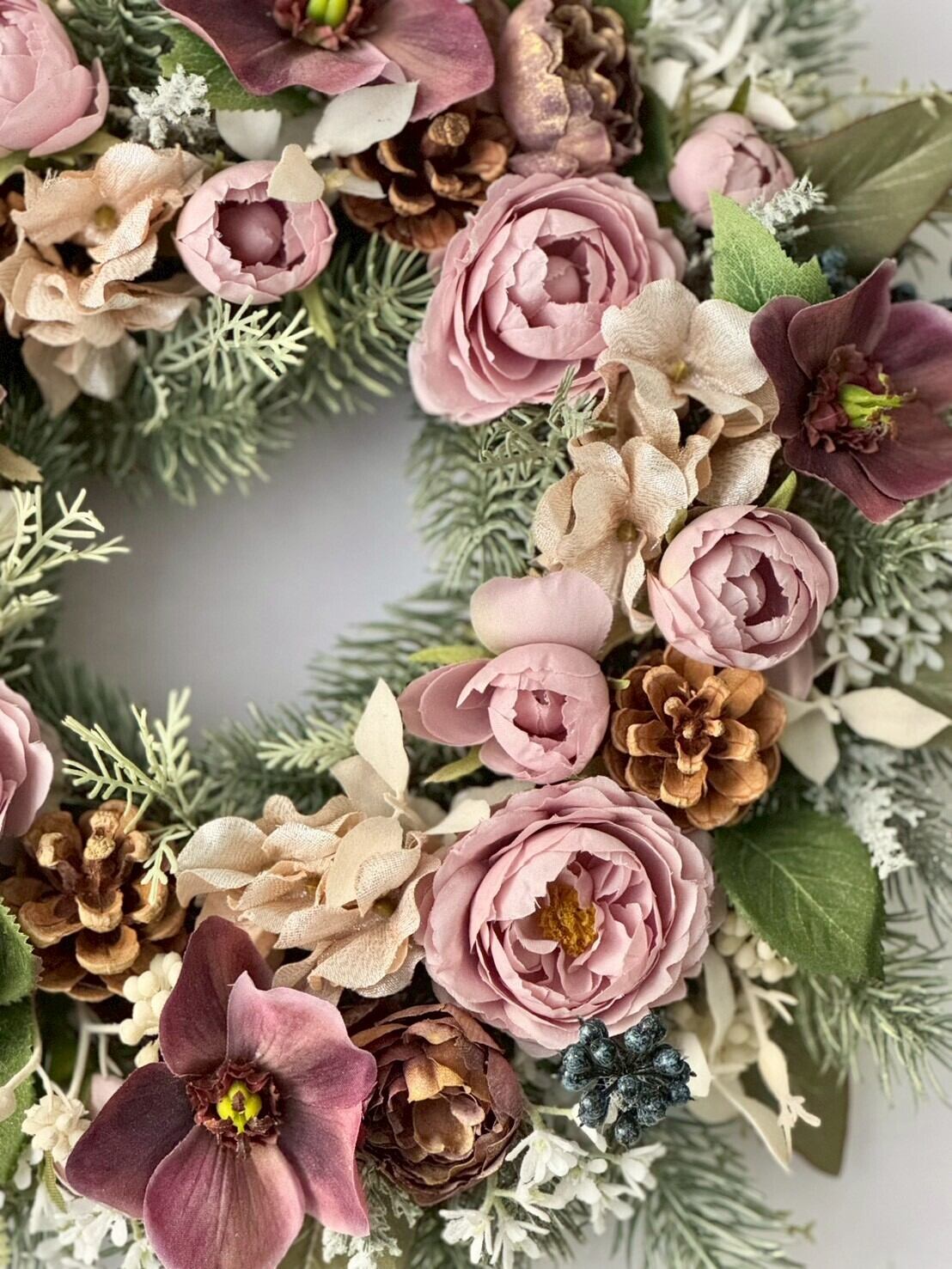こちらのリースにはアーティフィシャルフラワーを使用しており