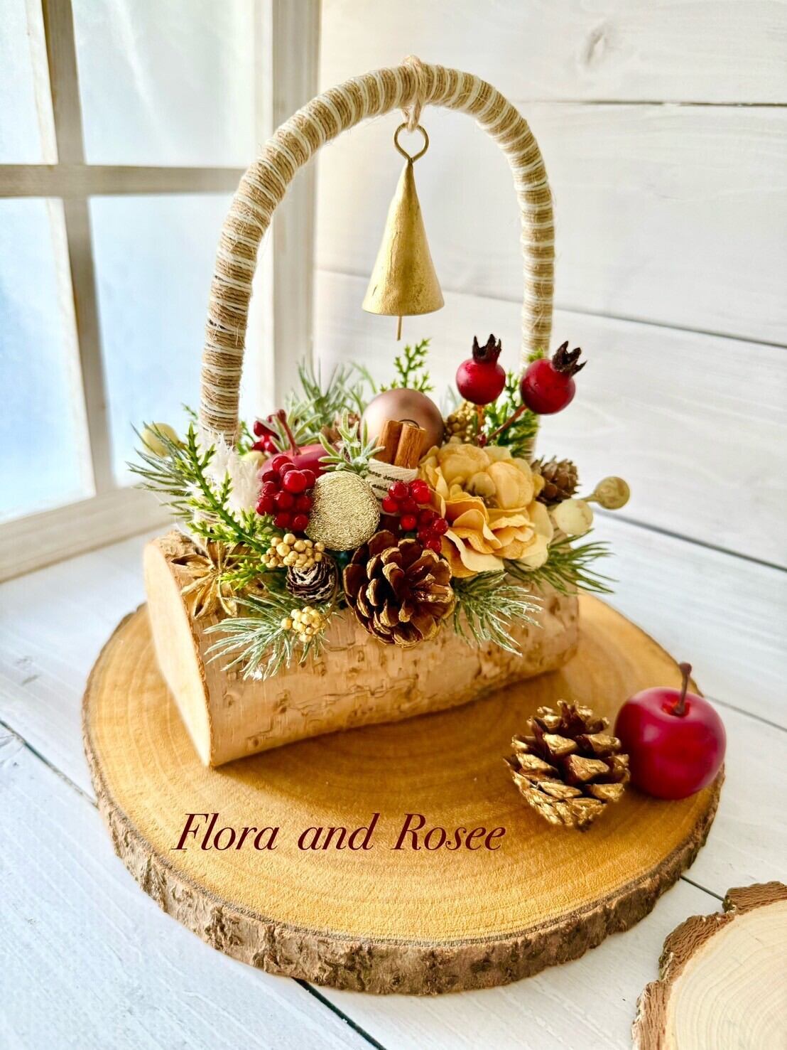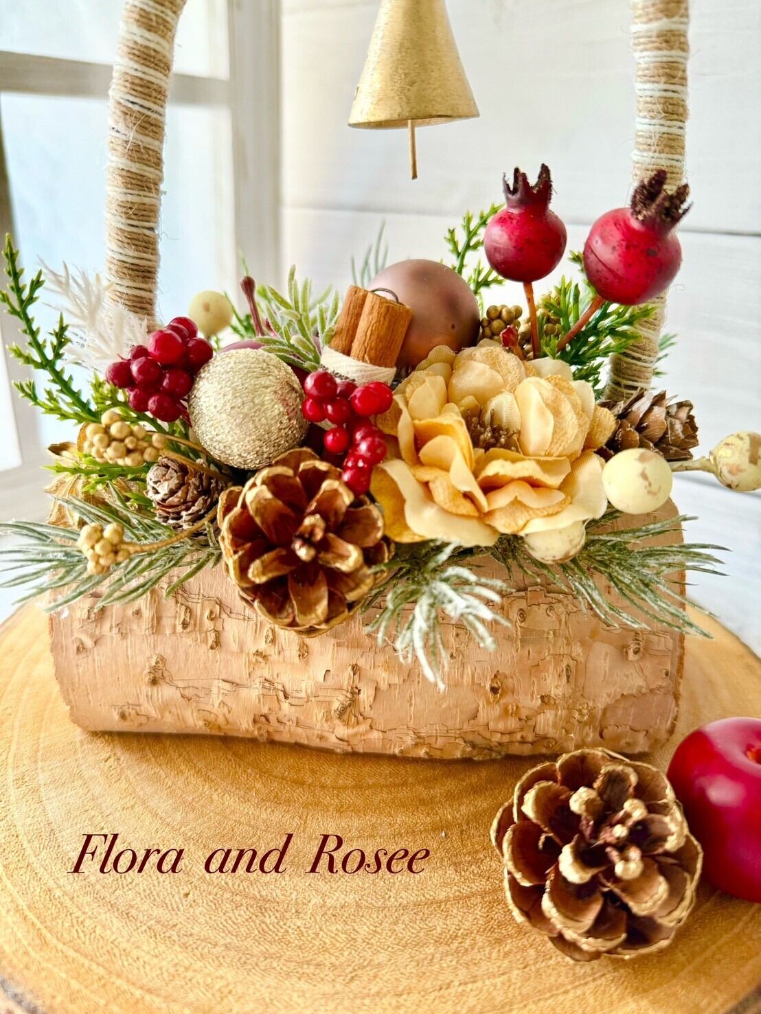 白樺の切り株をくり抜いた器にハニーイエローのバラ